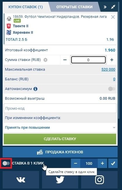 Live-ставки на сайте «1хСтавка» обрабатывались быстро, если игрок хотел упростить процесс, он мог воспользоваться опцией заключения мгновенных пари «в 1 клик». Для этого в купоне нужно было перевести переключатель в активное положение и обозначить желаемую сумму быстрой ставки. Система оповещала о включении услуги сообщением на экране.