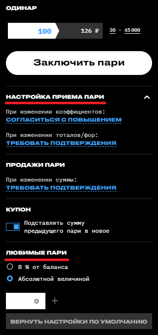 В окне «Новое пари» можно настроить более быстрое оформление ставок. Для этого открываем меню «Настройка приема пари». Здесь можно настроить согласие на изменение коэффициентов и установить любимые суммы пари. Стандартным размером ставки может быть и точная сумма в рублях, и процент от баланса игрового счета.