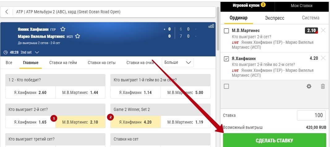Авторизуйтесь, найдите нужный вид спорта и интересующее событие. Затем: