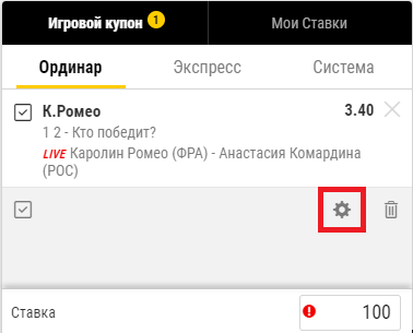 Чтобы ускорить заключение пари в блоке «Игровой купон», зайдите в настройки ставок (значок «шестеренка»).