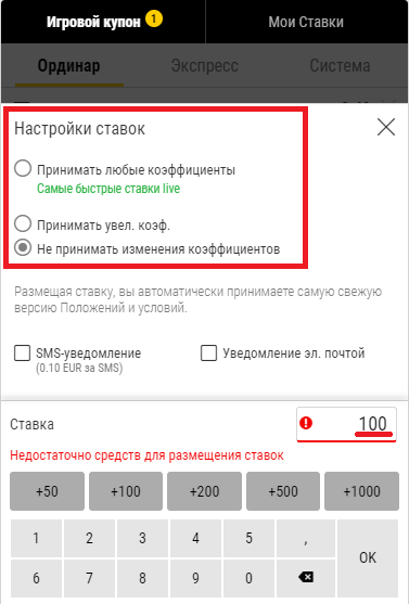 В открывшемся меню есть настройка согласия с изменением коэффициентов. Стандартный размер пари составляет 100 рублей. Сумму ставки можно вписать вручную либо воспользоваться кнопками в нижней части купона.