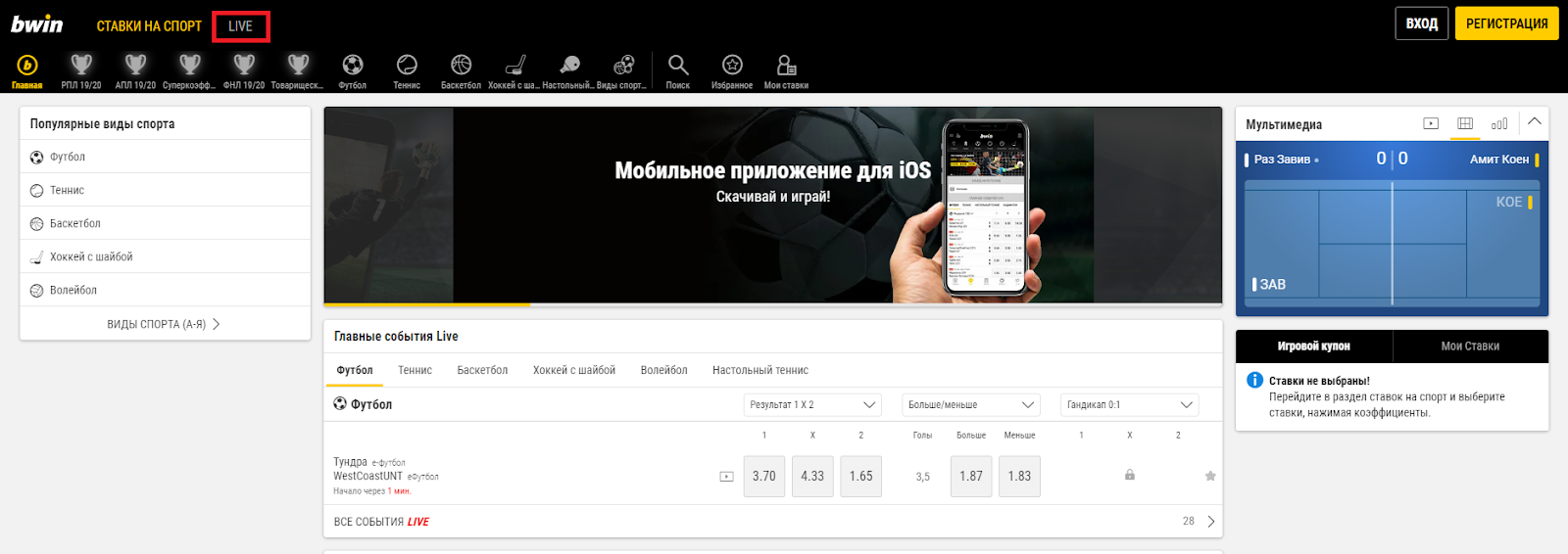 На главной странице БК Bwin представлен список самых популярных live-событий. Все события для ставок вы найдете на вкладке «Live» в верхней части экрана.