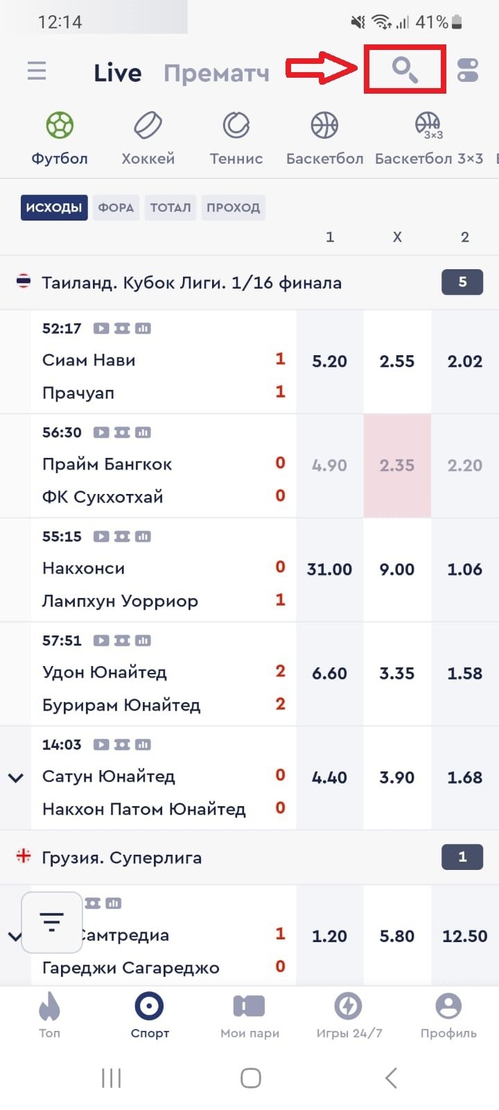 Иконка «лупа» для поиска событий в разделе «Спорт»