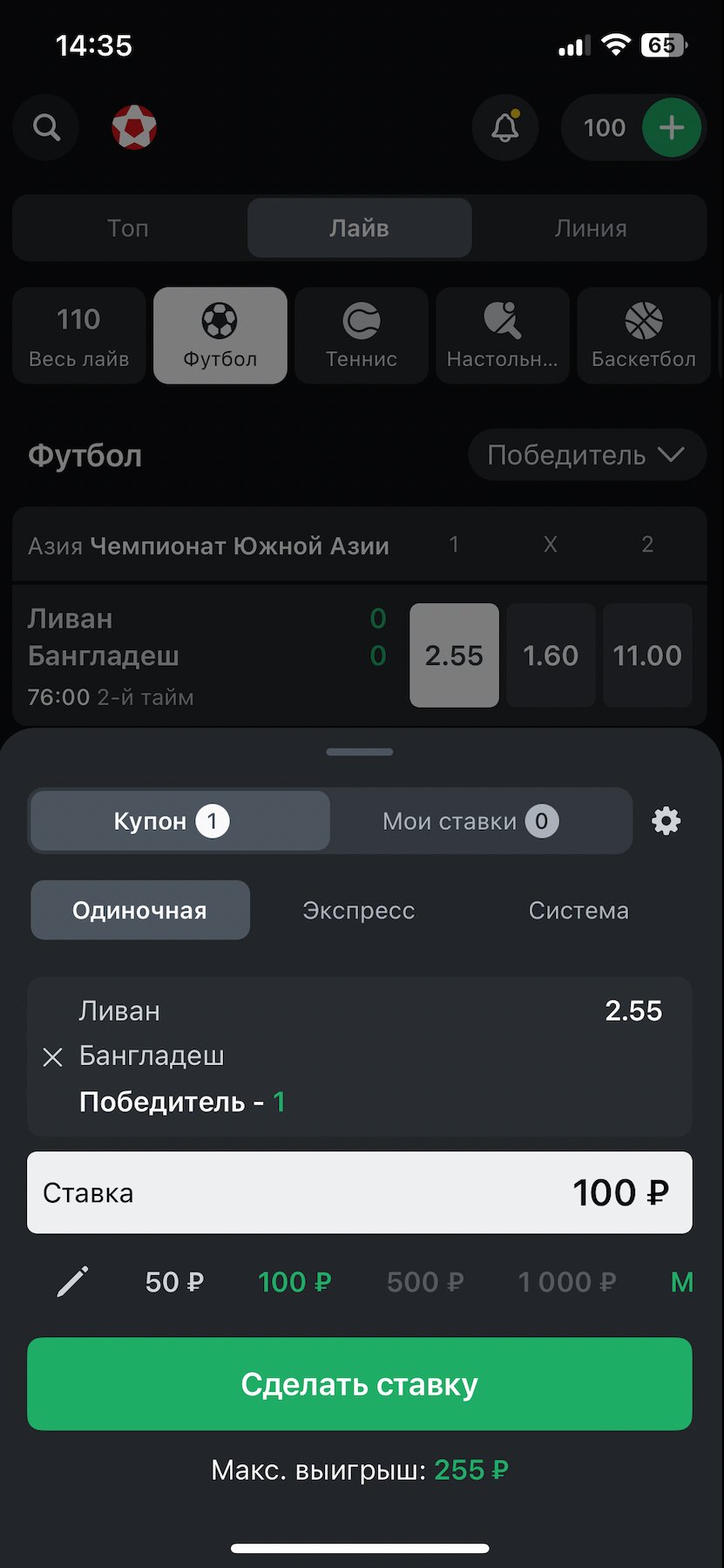 Чаще всего в лайв-линии доступны футбол, баскетбол, хоккей. Периодически предлагают пари на киберспорт, бадминтон или настольный теннис.