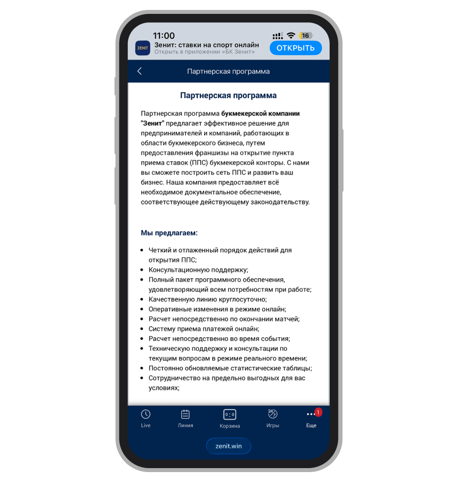 Данные об этом формате доступны на официальном сайте zenit.bet в разделе «Партнёрская программа». Букмекер предлагает открыть наземный пункт приёма ставок по франшизе, предоставляя все необходимые документы и разрешения для работы, а также: