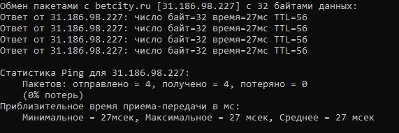 Для начала убедитесь, что ваш Интернет работает нормально. Для этого найдите на компьютере приложение «Командная строка» (cmd.exe). В открывшемся окне введите ping www.betcity.ru. Это нужно, чтобы проверить, получает ли компьютер отклик с сайта букмекера. Если все в порядке, на экране появится информация о пересылке пакетов данных.