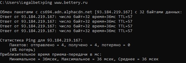 Прежде всего убедитесь, что ваш Интернет работает нормально и доступ к сайту не заблокирован. Откройте на компьютере приложение «Командная строка» и введите в открывшемся окне «ping www.bettery.ru». Так можно узнать, получает ли компьютер отклик от страницы букмекера. Если сайт работает нормально, результат будет следующим.