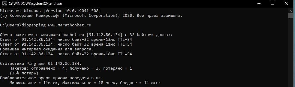 Прежде всего необходимо проверить, есть ли у вас интернет-соединение с сайтом букмекера. Для этого сочетанием клавиш «Windows+R» откройте панель запуска, введите в ней «cmd» и нажмите «OK». Появится командная строка, в которой необходимо ввести ping www.marathonbet.ru.