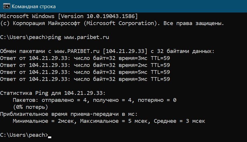 Скопируйте в командную строку «ping parimatch.ru» и нажмите «Enter».