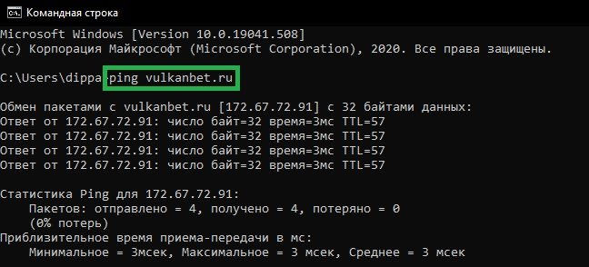 Первая причина, по которой веб-страница может не открываться, — плохое интернет-соединение или его отсутствие. Чтобы проверить качество отклика с сайтом «Вулканбет»:
