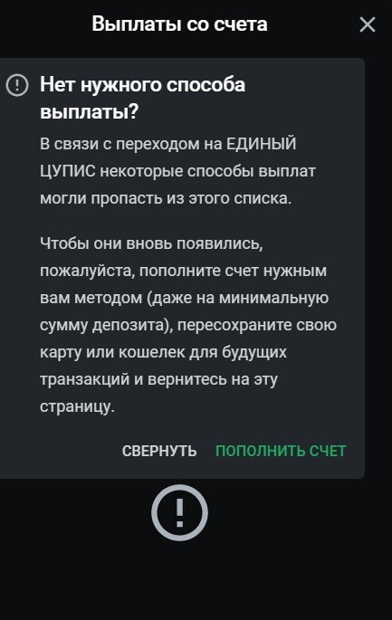 Вопросы могут возникнуть в том случае, если вы заводили деньги на свой аккаунт при помощи мобильных платежей МТС, «Билайн», «Мегафон» или Теле2 или пополняли счёт в терминалах «Элекснет». Букмекер вправе предложить вам метод вывода, но если хотите выбрать сами, то заведите минимальную сумму через желаемую карту или кошелёк, а потом воспользуйтесь ими для снятия.