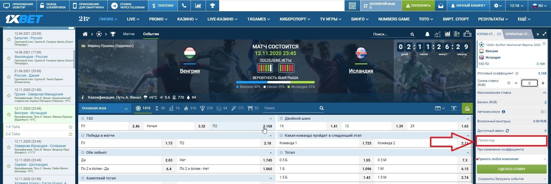 Действующие клиенты БК 1xBet могут использовать промокод на бесплатную ставку в купоне ставок. Для этого найдите в линии интересующий матч и выберите нужный исход. В окне «Купон ставки» появится специальное окно для ввода промокода.