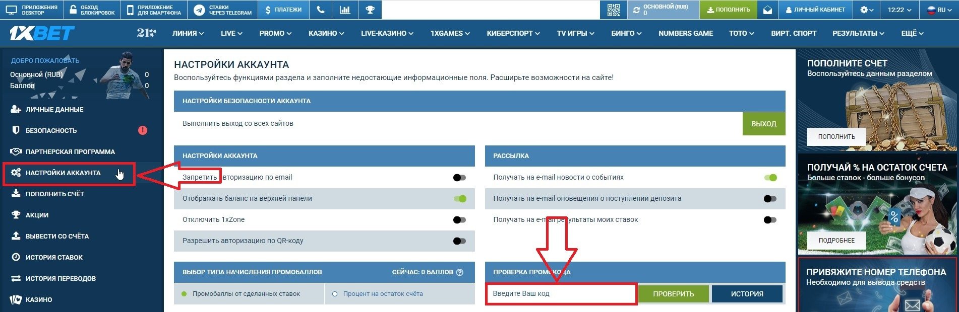 В личном кабинете пользователь всегда может узнать подробности об имеющемся промокоде 1 икс бет на сегодня. Зайдите на вкладку «Настройки аккаунта» и введите код в поле поле «Проверка промокода».