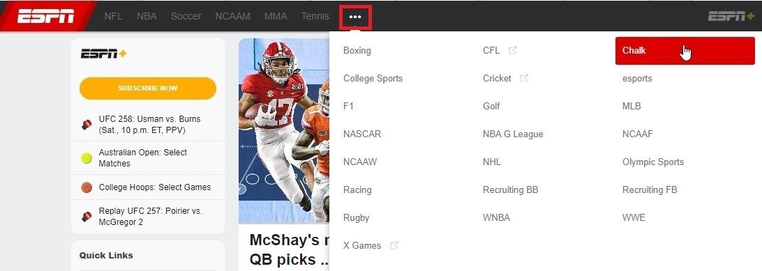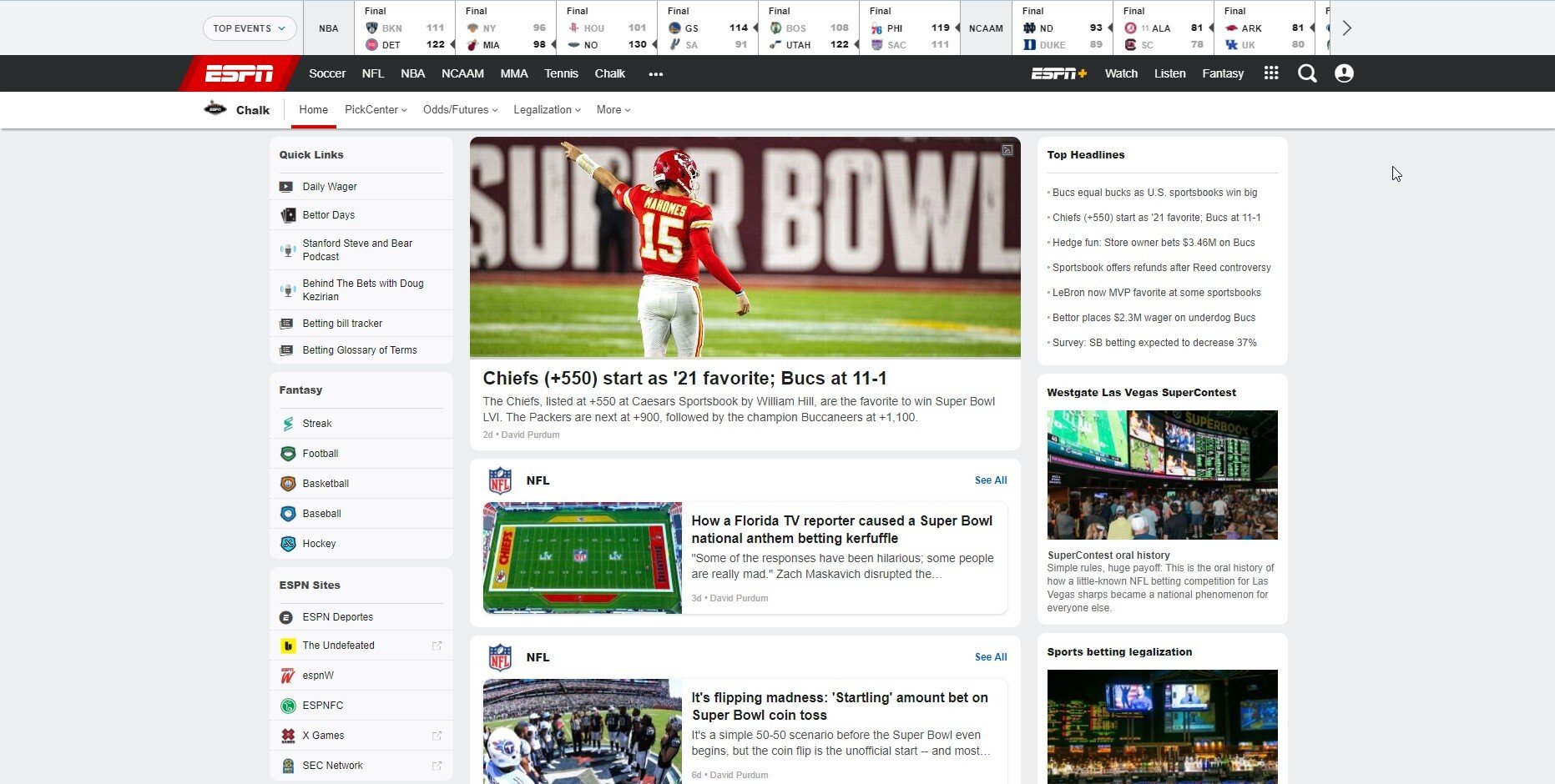 На ESPN есть раздел, посвященный теме беттинга — Chalk. Журналисты освещают события из сферы ставок, дают прогнозы на ближайшие матчи и на сезон. О нем мы расскажем подробно.