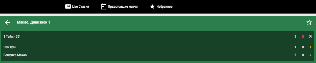 Помимо видеотрансляции на странице матча есть небольшое электронное табло, на котором отображаются счет и несколько дополнительных статистических показателей. Например, во время футбольных противостояний показано, сколько минут команды провели на поле, количество голов в таймах, угловых (не всегда) и удалений. Подобная инфографика есть практически во всех live-событиях, чемпионат Макао по футболу не исключение.