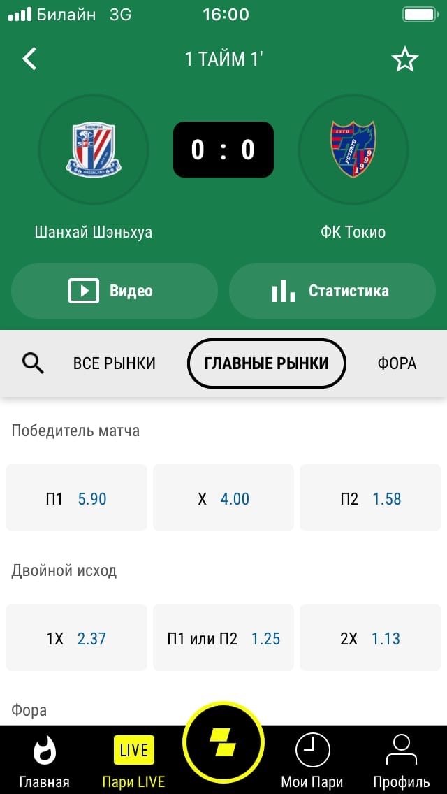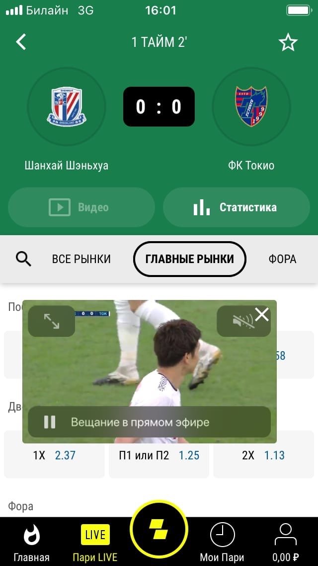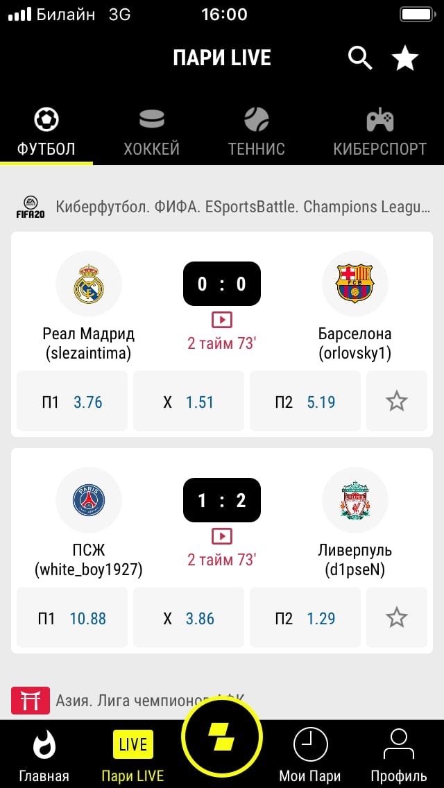 В приложениях прямые эфиры находятся в разделе «Пари LIVE».