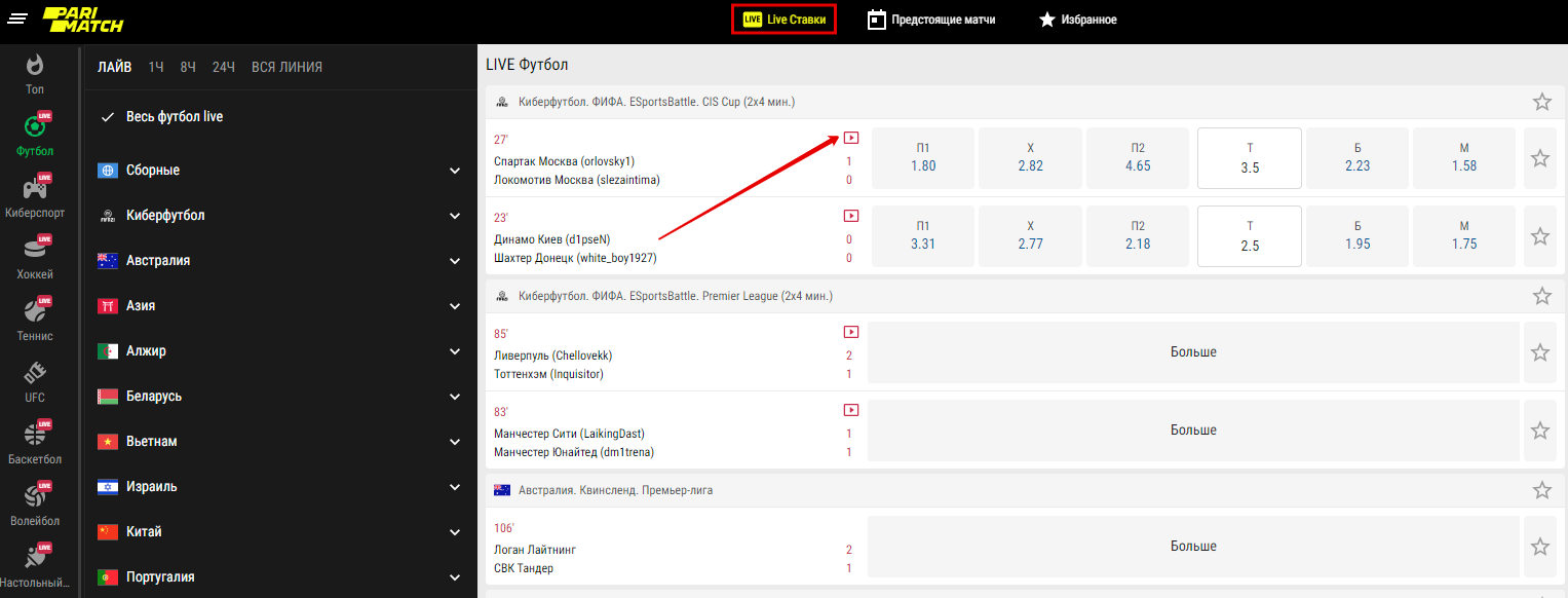 Букмекерская контора «Париматч» транслирует матчи в прямом эфире на официальном сайте, мобильной версии, а также в приложениях на Андроид и iOS. Видеотрансляции можно найти в разделе с лайв-ставками на всех платформах. Такие события отмечены в линии красным прямоугольником со значком play.