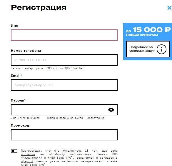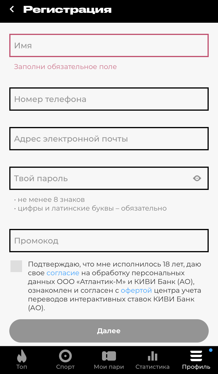 В стандартной форме новому игроку надо ввести имя, номер телефона, электронную почту, пароль и промокод (при наличии). Подтверждаем совершеннолетие и согласие на обработку данных, кликаем «Далее».