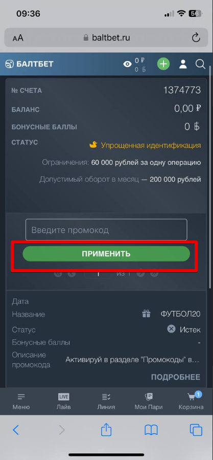 Применение промокода в букмекерской конторе «Балтбет»