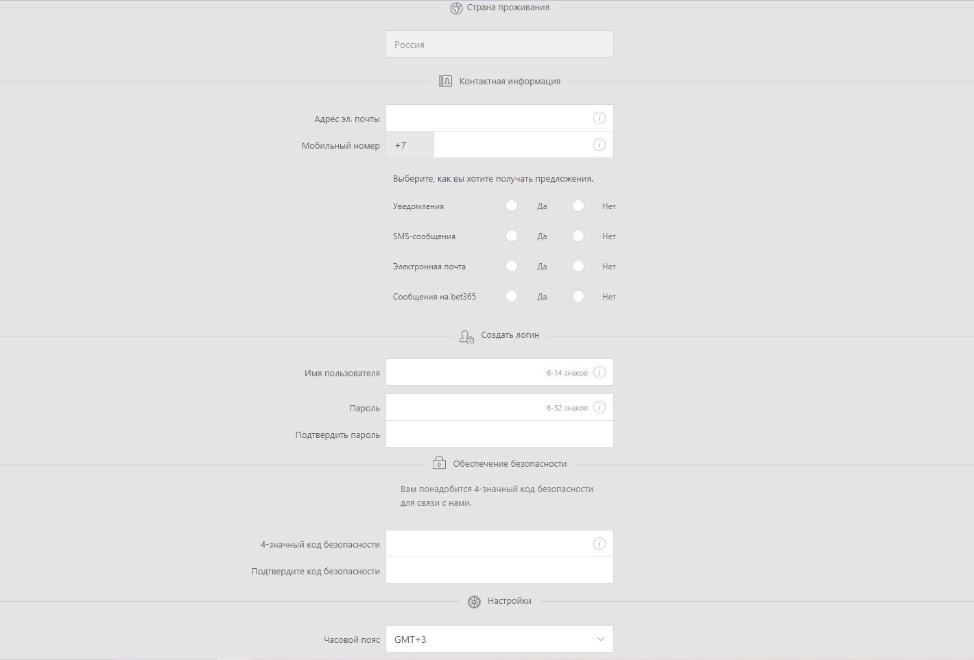 Чтобы зарегистрироваться в БК bet365, нужно указать свой email, номер телефона, часовой пояс, формат коэффициентов и промокод. В форме регистрации также требуется настроить параметры уведомлений, создать уникальный логин, пароль и четырехзначный код безопасности.