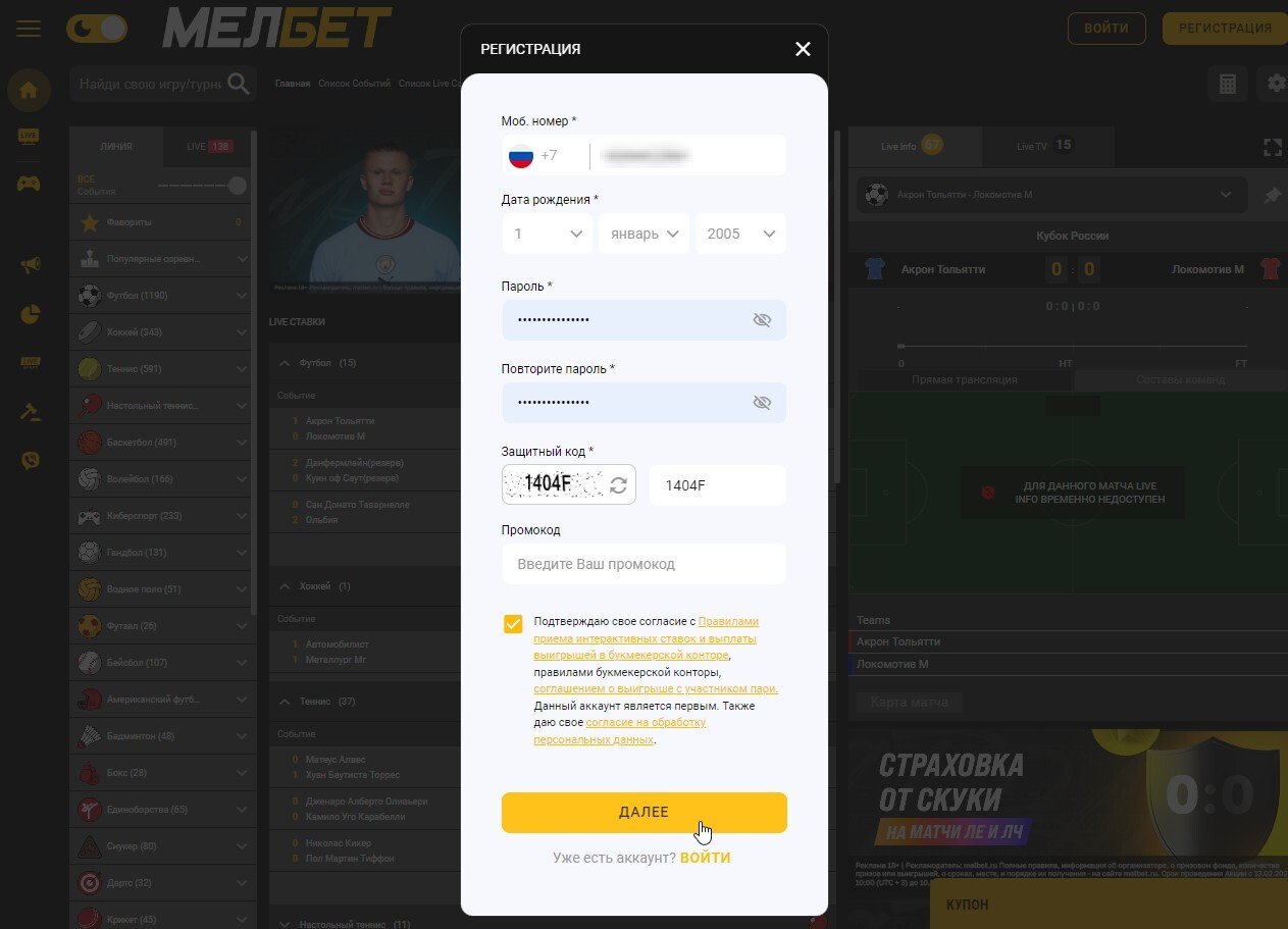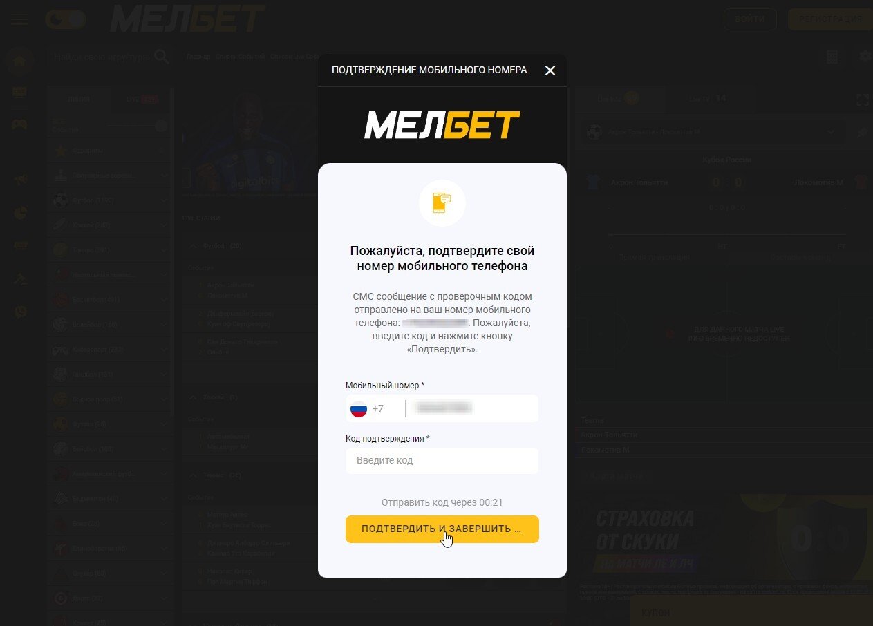 придумать пароль (и повторить его), указать защитный код и согласиться с правилами БК Мелбет;