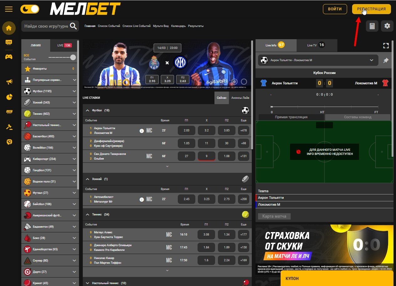 - зайти на официальный ресурс букмекерской компании Melbet и кликнуть на кнопку «Регистрация», которая находится справа вверху;