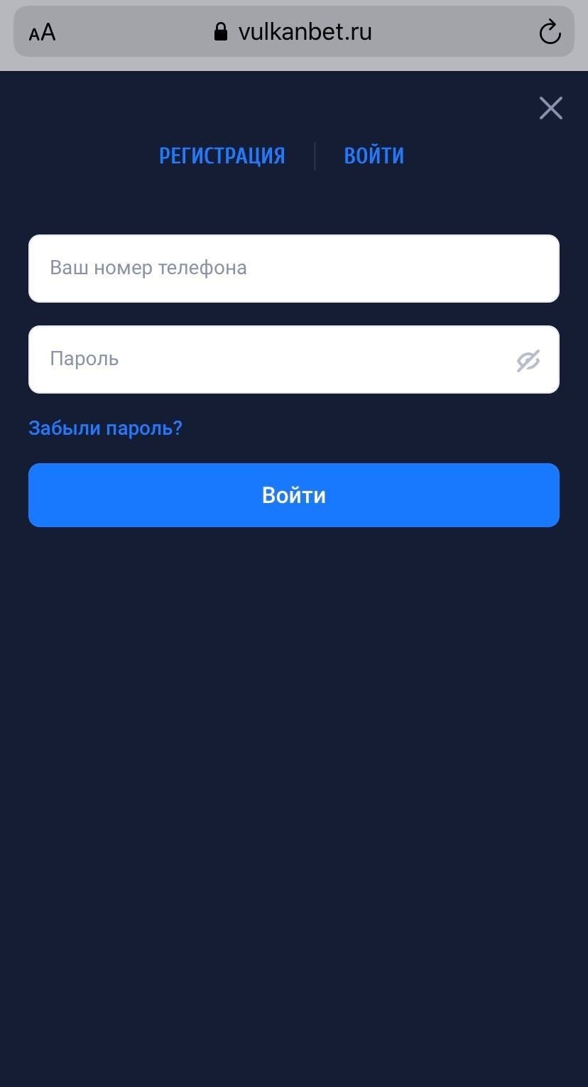 Зарегистрироваться в БК «Вулканбет» можно и с мобильного телефона. Для этого в браузере смартфона нужно перейти на сайт букмекера и нажать кнопку «Вход», которая будет находиться в верхней части экрана, а затем в открывшемся окне выбрать вкладку «Регистрация».