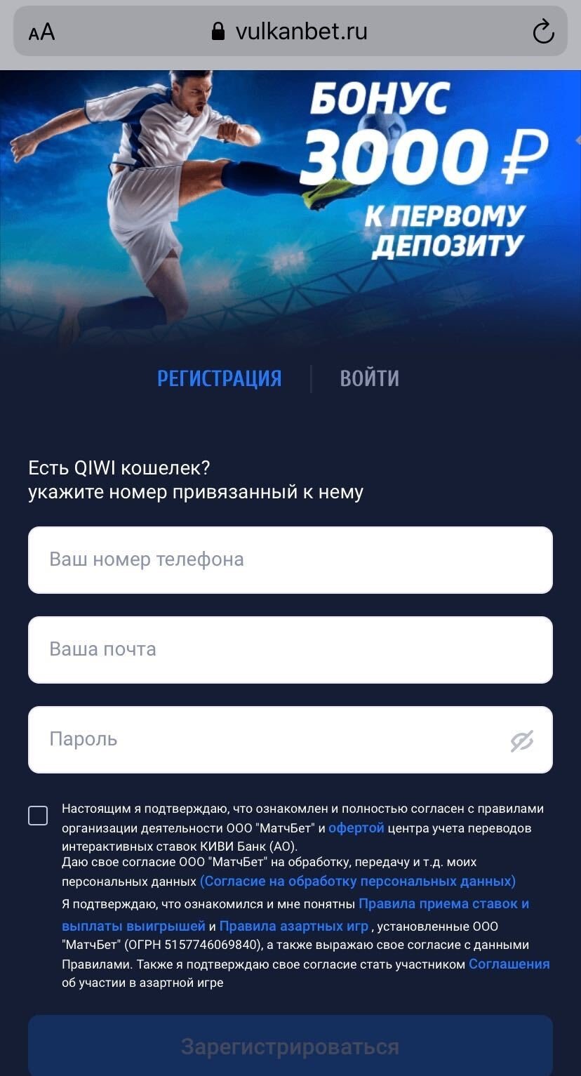 Регистрация на официальном сайте БК «Вулканбет»