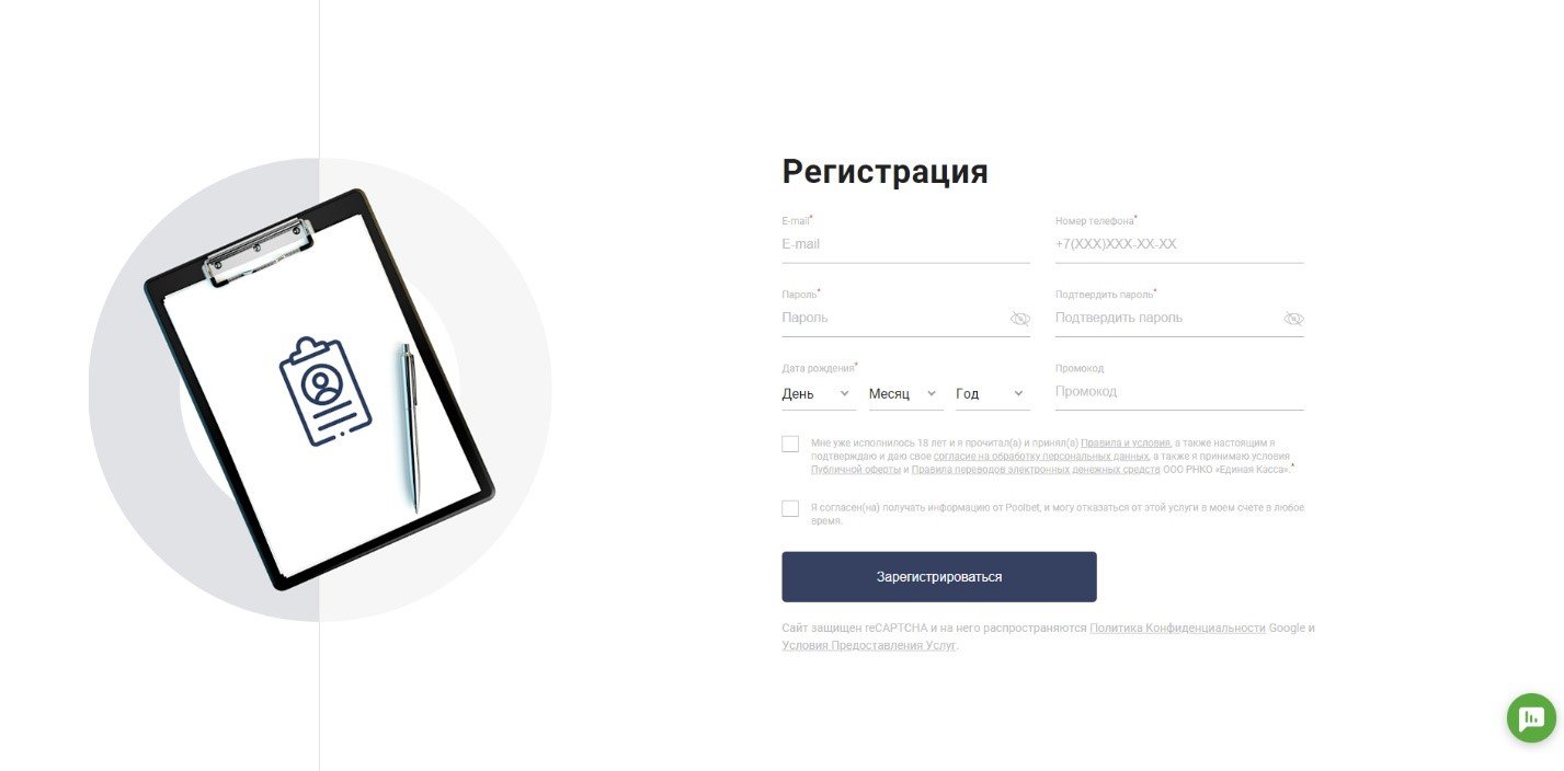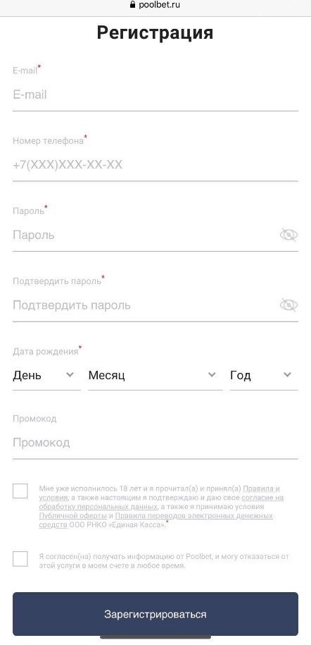После нажатия на кнопку регистрации в меню на сайте тотализатора Poolbet игрок попадет на страницу, где нужно заполнить основную информацию с личными данными. На этом этапе требуется указать только дату рождения, адрес электронной почты, актуальный номер телефона, а также придумать пароль. При наличии действующего промокода игрок может ввести его в соответствующее поле.