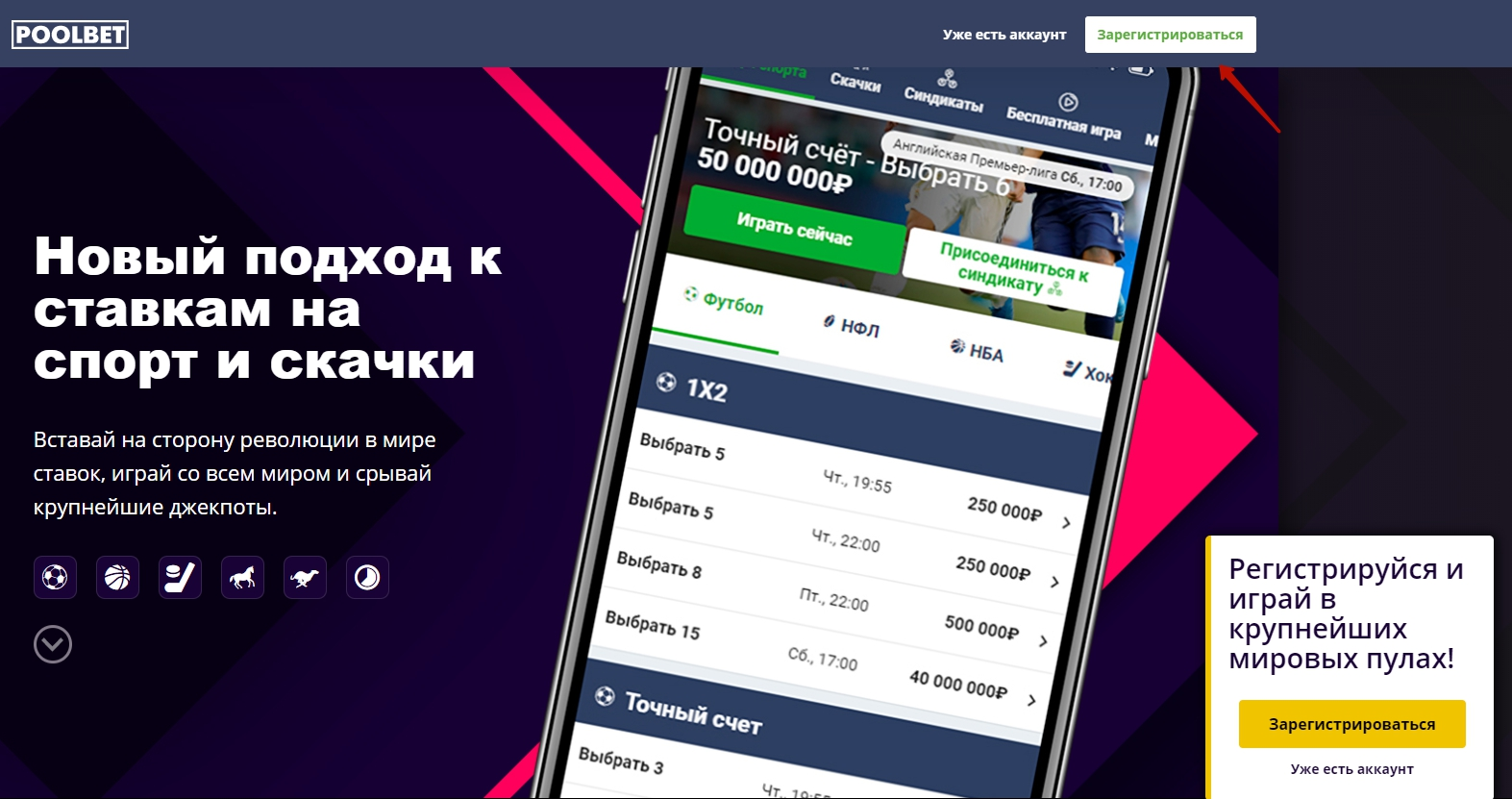 Poolbet – легальный онлайн-тотализатор, работающий с 2019 года. Принцип работы тотализатора отличается от классических букмекерских контор. Здесь нет привычных коэффициентов, а пари заключается сразу на несколько событий. В «Пулбет» можно играть в одиночку или в составе синдиката. Подробнее можно прочитать в нашей инструкции, а в этом материале мы расскажем, как зарегистрироваться в тотализаторе Poolbet.