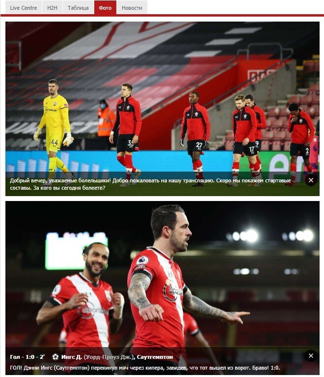 Текст. Текстовая трансляция матча с указанием основных событий на игровом поле по минутам. В окне текстовой трансляции можно увидеть фото с матча.