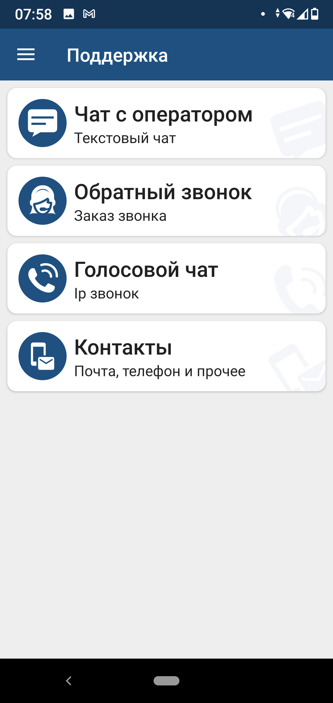 Поддержка. Android-приложение 1xBet предлагает три варианта связи с оператором: онлайн-чат, заказ обратного звонка голосовой чат с использованием IP-телефонии, горячая линия и сразу четыре адреса электронной почты.