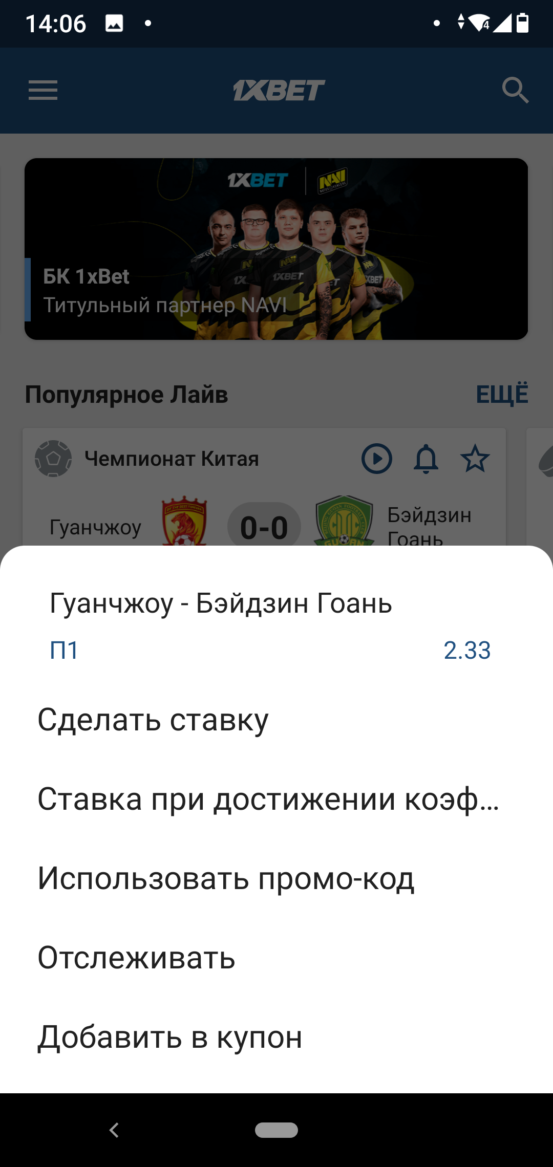 На главной странице 1xBet два раздела: «Популярное Лайв» и «Популярное Линия». События прокручиваются свайпом вправо, на баннере каждого есть основные исходы с коэффициентами и «звездочка», чтобы добавить событие в «Избранное». Для лайв-матчей также отображаются наличие прямой трансляции и настройка push-уведомлений.