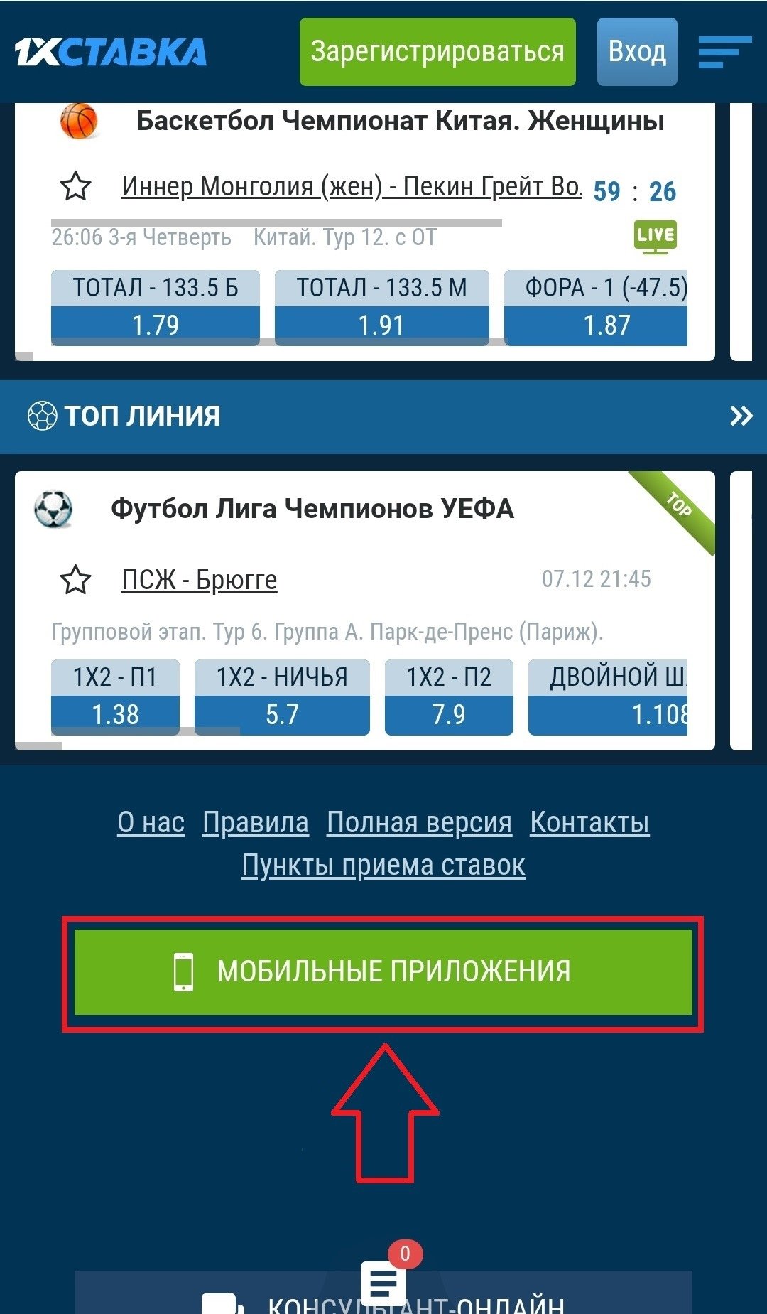 Самый простой способ, как можно было скачать мобильное приложение — зайти на сайт 1xstavka.ru со смартфона или планшета, на который игрок планировал установить софт. Внизу появлялась кнопка с надписью «Мобильные приложения».
