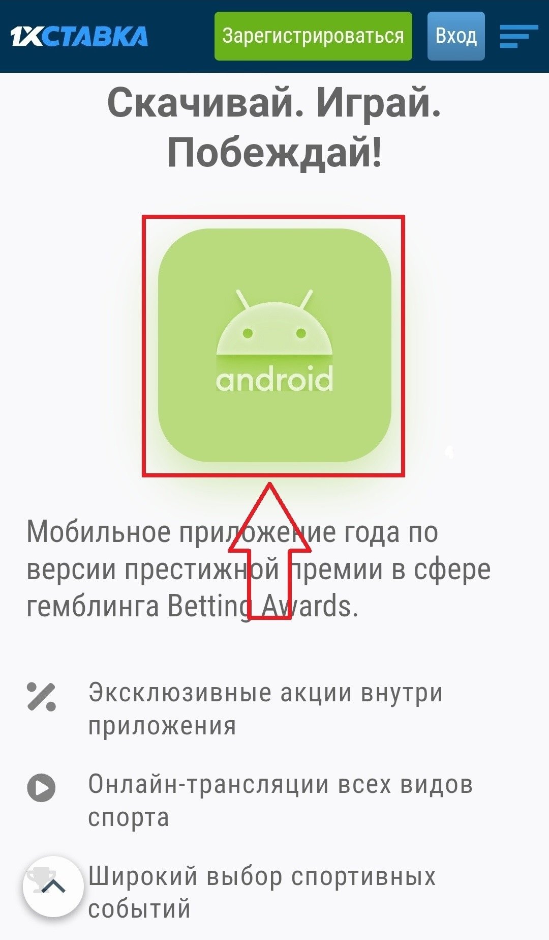 Клиент попадал на страницу «Мобильные приложения». Там следовало нажать на логотип Андроид и загрузить файл apk. Необходимо было открыть его, чтобы скачать «1хСтавку», и, если система выдавала предупреждение, одобрить установку из неизвестных источников. Чтобы обновить приложение БК «1хСтавка», приходилось снова зайти на сайт и скачать актуальный файл apk.