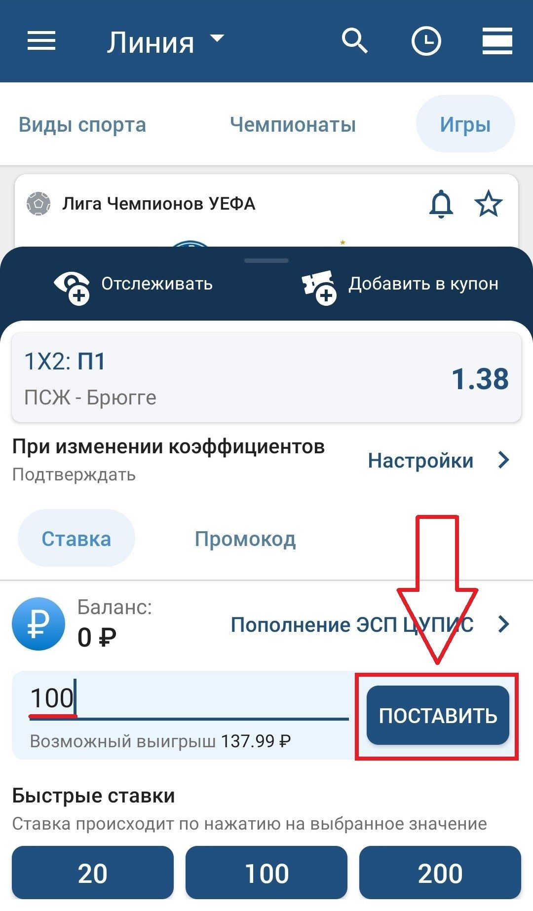 При нажатии на коэффициент в росписи открывался купон, там нужно было обозначить тип ставки и желаемую сумму пари. На финальном этапе оставалось нажать «Поставить» — и всё готово.