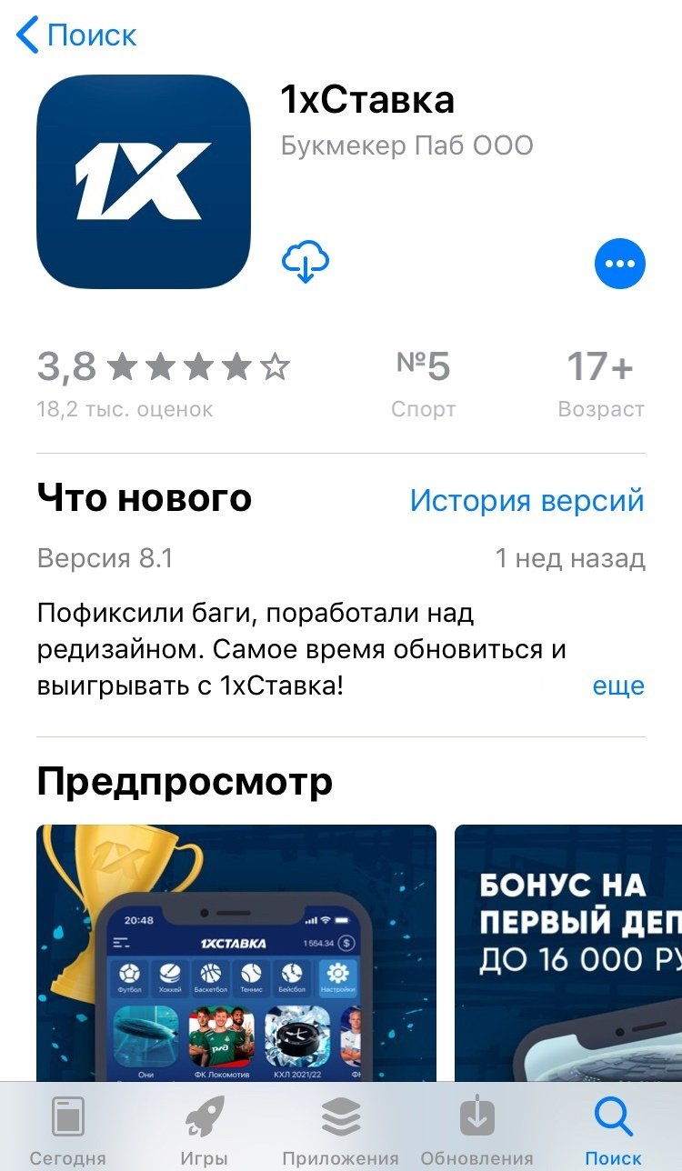 Информация о приложении «1хСтавка» для iOS