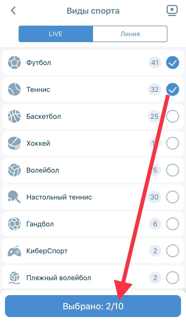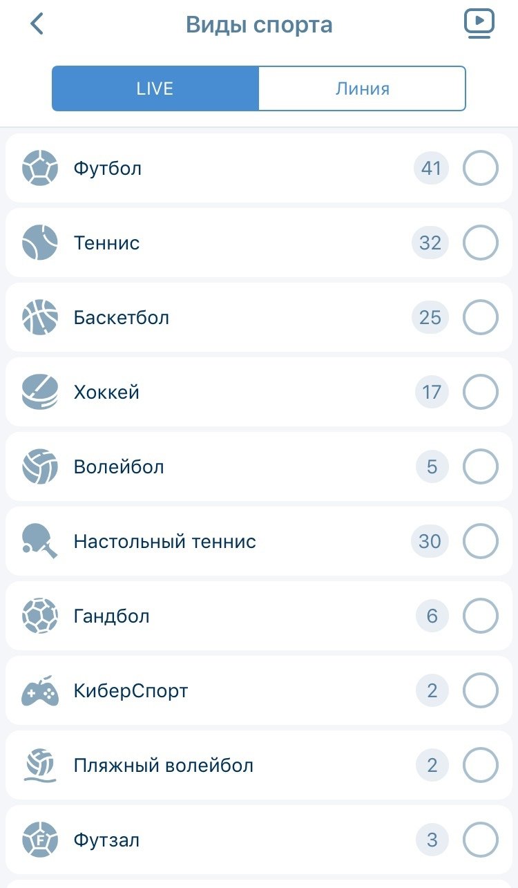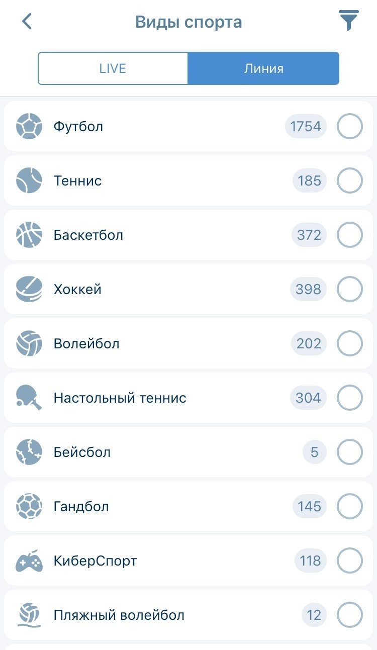 События делили по двум пунктам меню — «Линия» и Live. В разделе Live существовала кнопка плеера, нажатие на которую отображало матчи с наличием видеотрансляции. В разделе «Линия» был фильтр по времени начала событий. Чтобы отобразить события по конкретным видам спорта, следовало поставить галочку в нужных пунктах и тапнуть плашку «Выбрано».