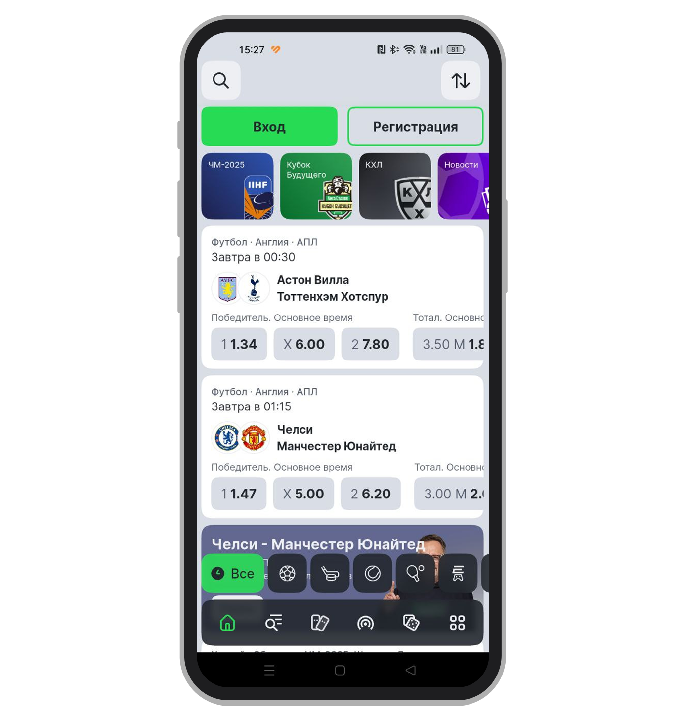 Чтобы сделать ставку, нужно выбрать матч и нажать на коэффициент интересующего исхода. Приложение автоматически покажет купон, где также можно будет установить сумму пари.