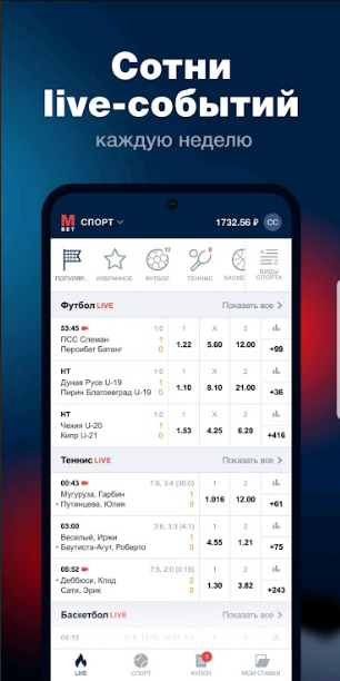 В приложении есть ставки на киберспорт. Они вынесены в отдельную категорию в меню «Спорт». События для ставок по ходу матча можно найти в меню LIVE.