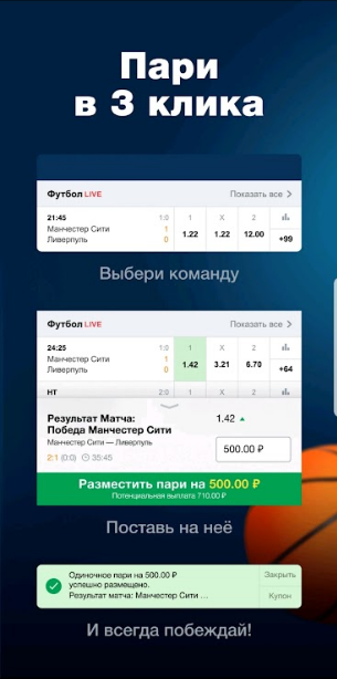 Спортивные события для ставок вы найдёте в разделах Live и «Спорт». Чтобы сделать ставку, выберите исход из росписи линии и нажмите на коэффициент. Во вкладке «Купон» появится подробное описание предлагаемого пари. При вводе суммы приложение сразу рассчитывает потенциальную сумму выигрыша.