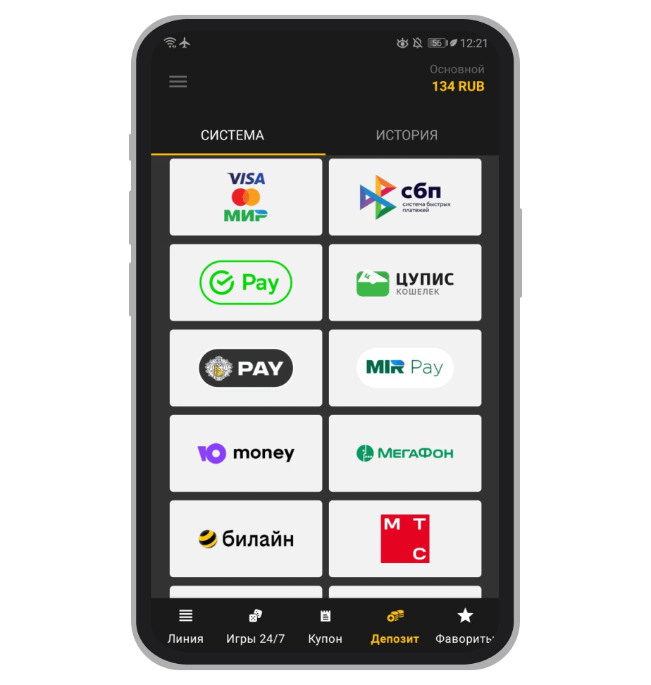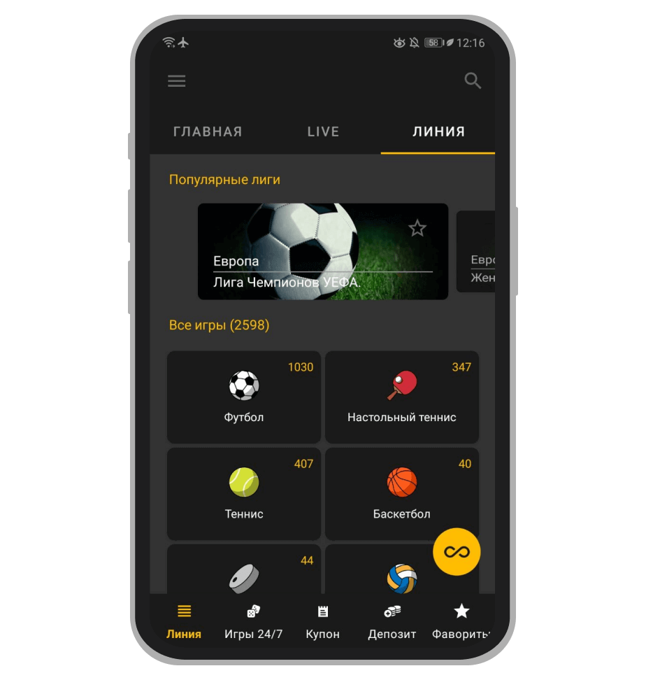 Чтобы сделать ставку в приложении на Android, выберите интересующее событие и нужный исход в разделе «Линия». Все выбранные исходы автоматически появятся в разделе «Купон», где можно выбрать тип пари — ординар, экспресс или система. Здесь же можно удалить лишние события, указать сумму ставки и подтвердить её.