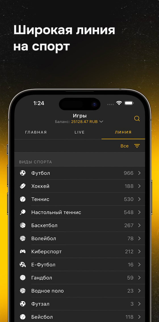 На главной странице мобильного приложения внизу все события находятся во вкладке «Линия» — матчи разделены на три категории: