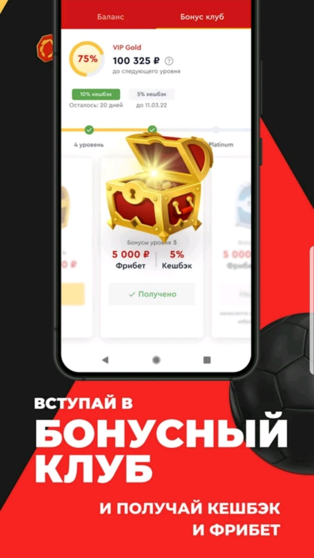 Для постоянных клиентов действует программа лояльности: размер фрибета — до 5000 рублей — зависит от присвоенного статуса, который определяется суммой ставок за календарный месяц.