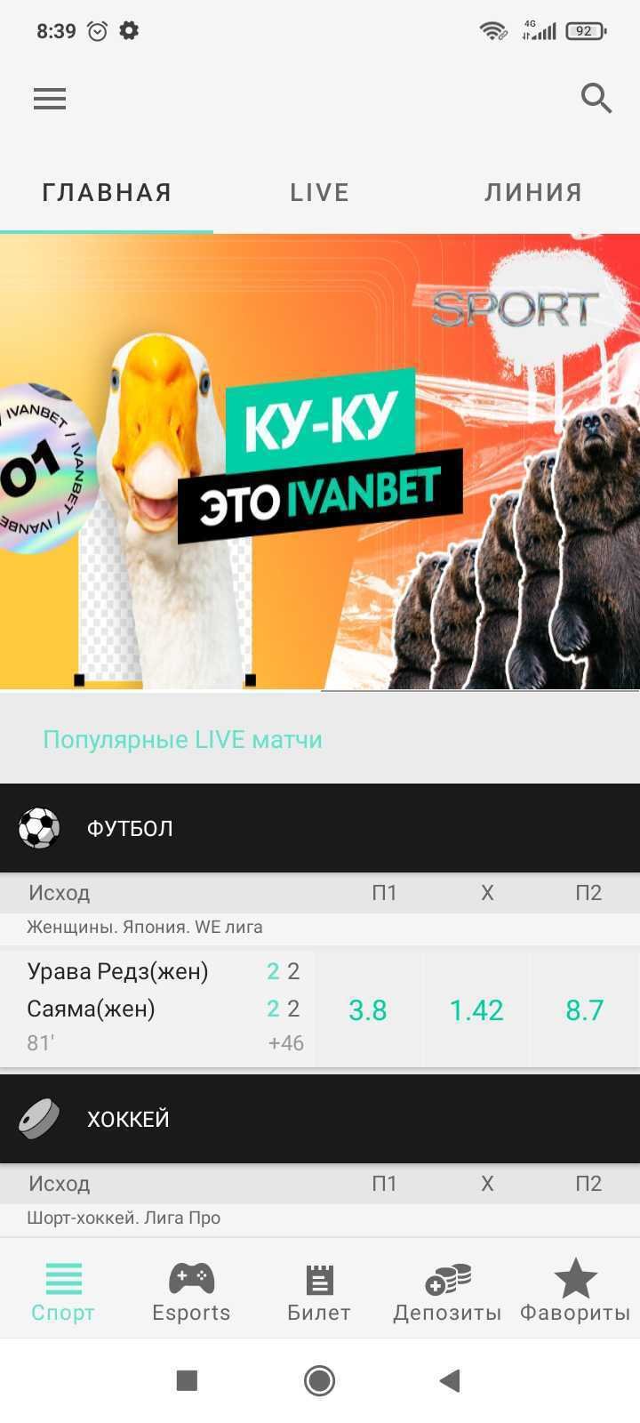 И, наконец, в нижнем меню приложения «Иванбет» собраны разделы «Спорт» (линия), Esport, «Билет», «Депозиты» и «Фавориты».