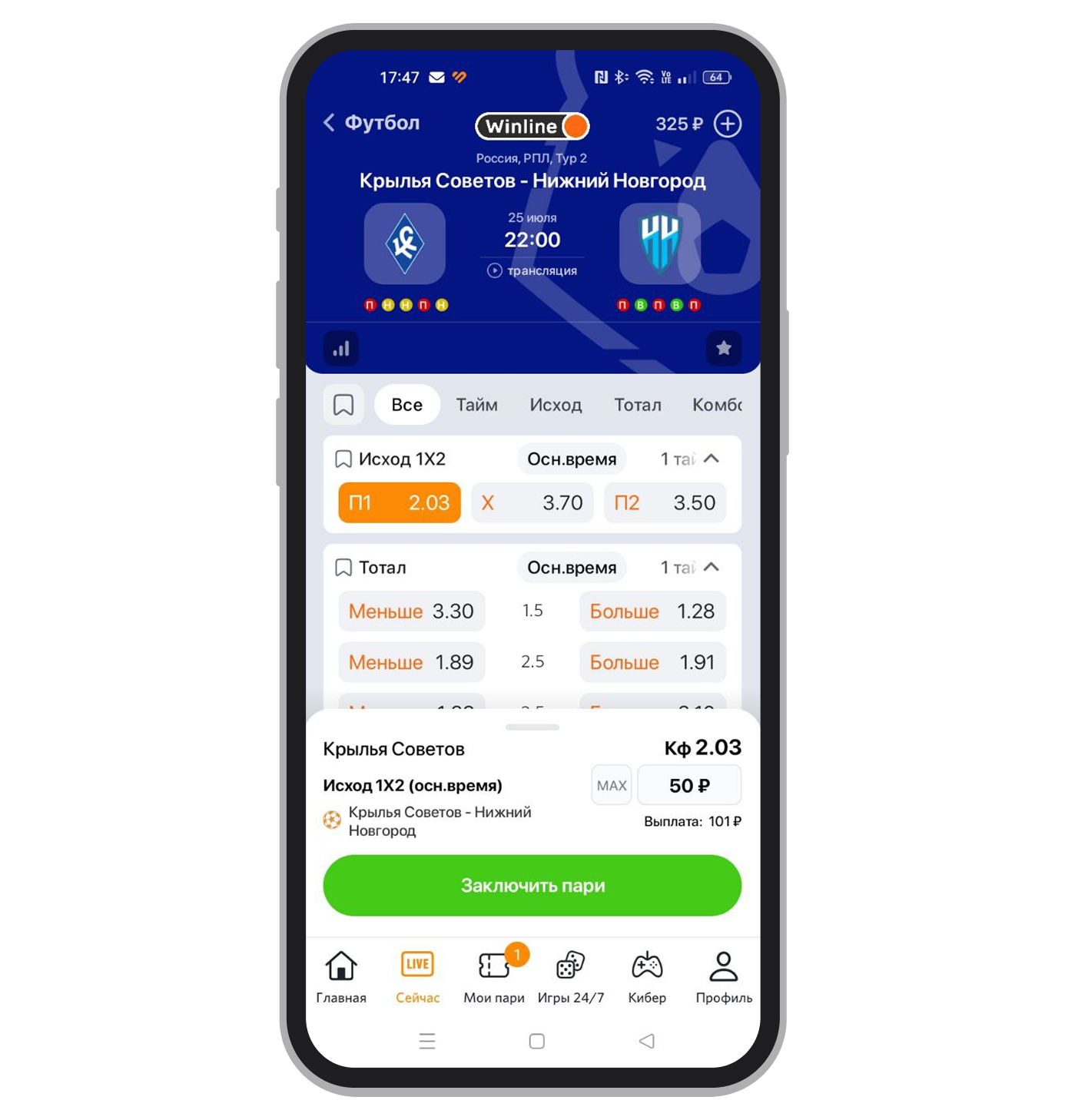 Минимальная сумма ставки в приложении Winline — 50 рублей. Процесс оформления пари состоит из трёх этапов: