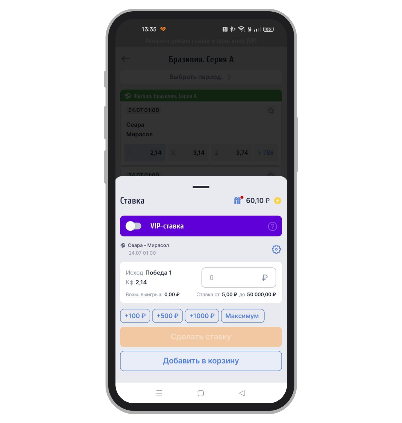 Корзина и история счёта. Все оформленные пари попадают в раздел «Ставки» в нижнем меню приложения. В этом разделе доступны лимиты на ставки, быстрый выбор сумм, а также активация VIP-пари. При нажатии на значок шестерёнки открывается дополнительное меню настроек. Через него можно: