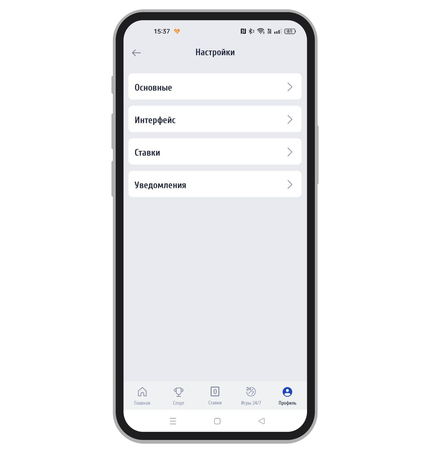 В меню «Профиль» БК «Зенит» можно настроить некоторые параметры приложения под себя. На вкладке «Настройки» предлагается: