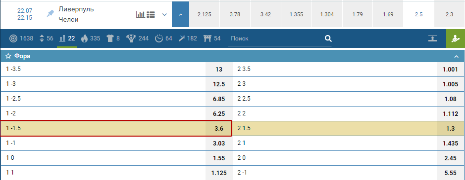 Рассмотрим вариант форы 1 (-1.5) на примере футбольного матча между «Ливерпулем» и «Челси». Букмекер предлагает сделать ставку на «Ливерпуль» с минусовой форой 1.5 и коэффициентом в 3.60.