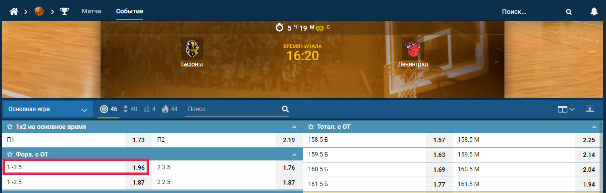 Выиграет ли ставка Фора 1 (-3.5), мы разберем на примере баскетбольного матча «Бизоны» — «Ленинград». Хозяева — фавориты встречи, коэффициент на их победу довольно маленький. Чтобы увеличить его, мы делаем ставку с минусовой форой.
